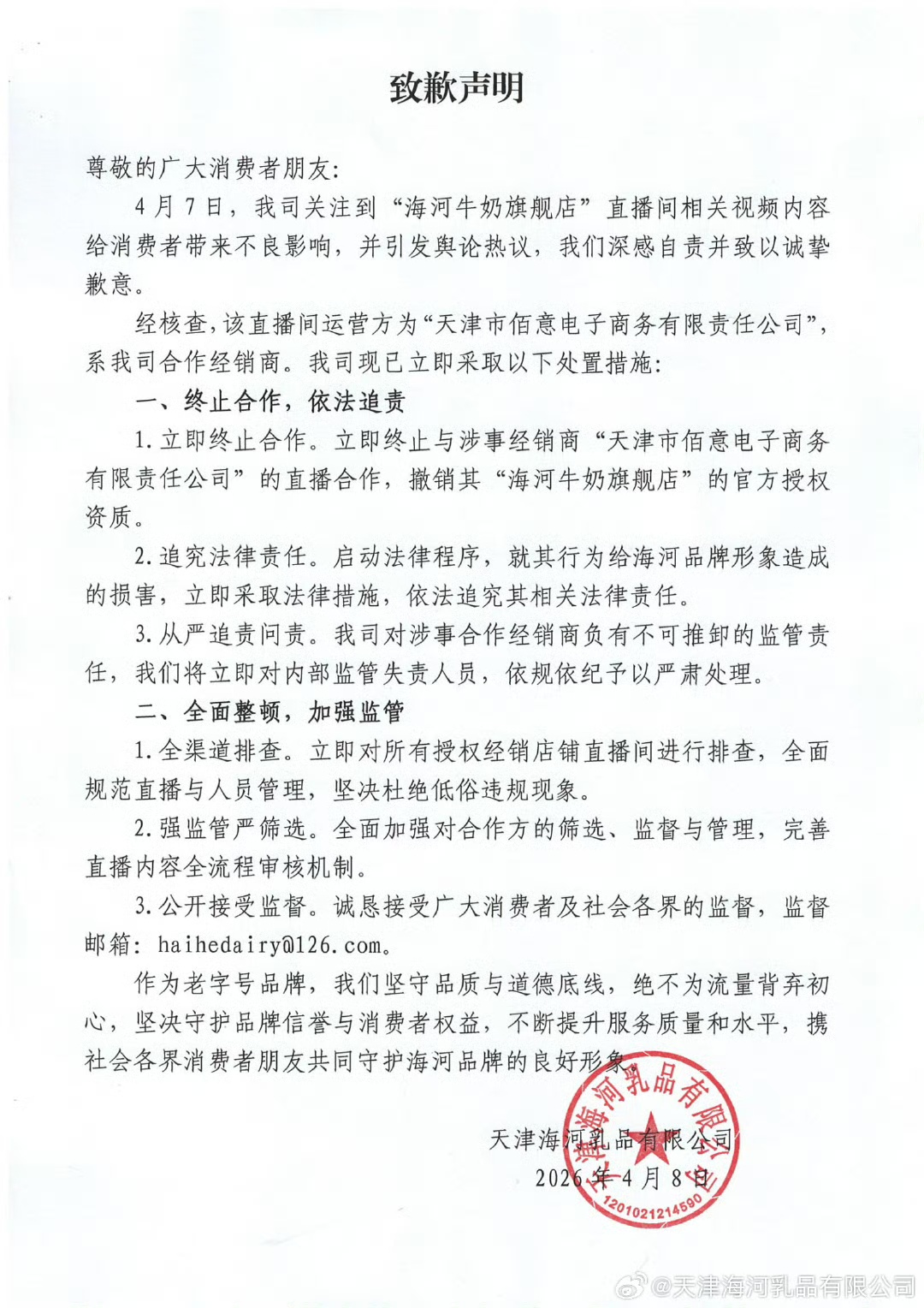 此外,据声明,海河乳品发动全面整改:对一切授权经销店肆的直播间展开全途径排查,标准直播与人员办理;强化协作方挑选、监督与全流程审阅机制;揭露监督邮箱,自动承受社会各界监督。